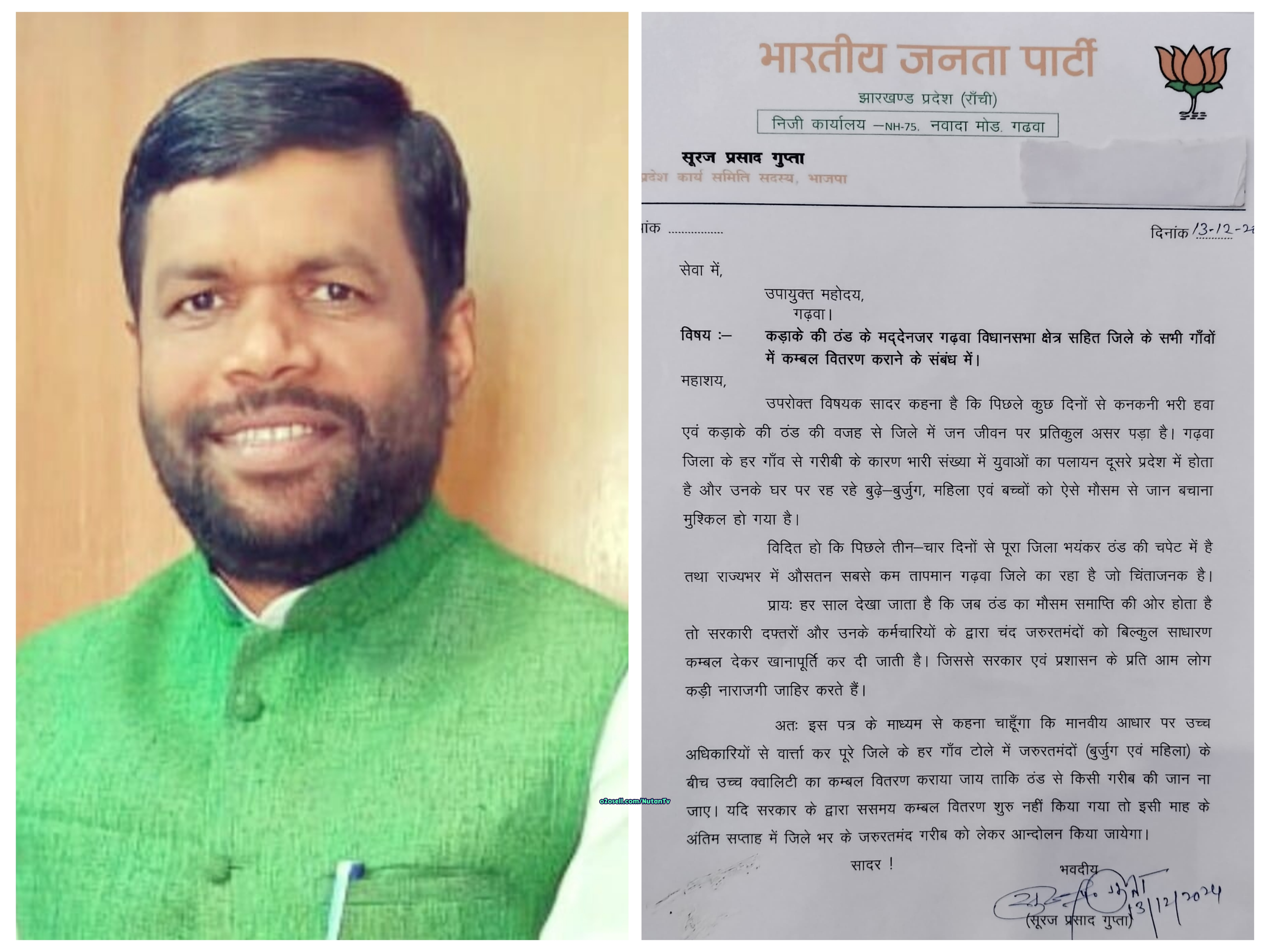 गढ़वा : भाजपा प्रदेश कार्य समिति सदस्य सह गढ़वा विधानसभा क्षेत्र के पूर्व प्रत्याशी सूरज गुप्ता ने उपायुक्त एवं जिला सामाजिक सुरक्षा पदाधिकारी को पत्र देकर गढ़वा विधानसभा क्षेत्र सहित जिले के सभी गांव में कड़ाके की ठंड के मद्देनजर कंबल वितरण करने का मांग किया है अपने पत्र में भाजपा नेता सूरज गुप्ता ने कहा है की कनकनी भरी हवा एवं कड़ाके की ठंड की वजह से गांव में रहने वाले बुजुर्ग व महिला एवं बच्चों के ऊपर प्रतिकूल असर पड़ा है। उन्होंने कहा कि गरीबी के कारण अधिकांश गांव के युवा दूसरे प्रदेशों में पलायन कर जाते हैं उनके घर पर रहने वाले बुजुर्ग एवं बच्चे तथा महिला का हालात बिल्कुल नाज़ुक हो जाती है और जान बचाना मुश्किल हो जाता है।