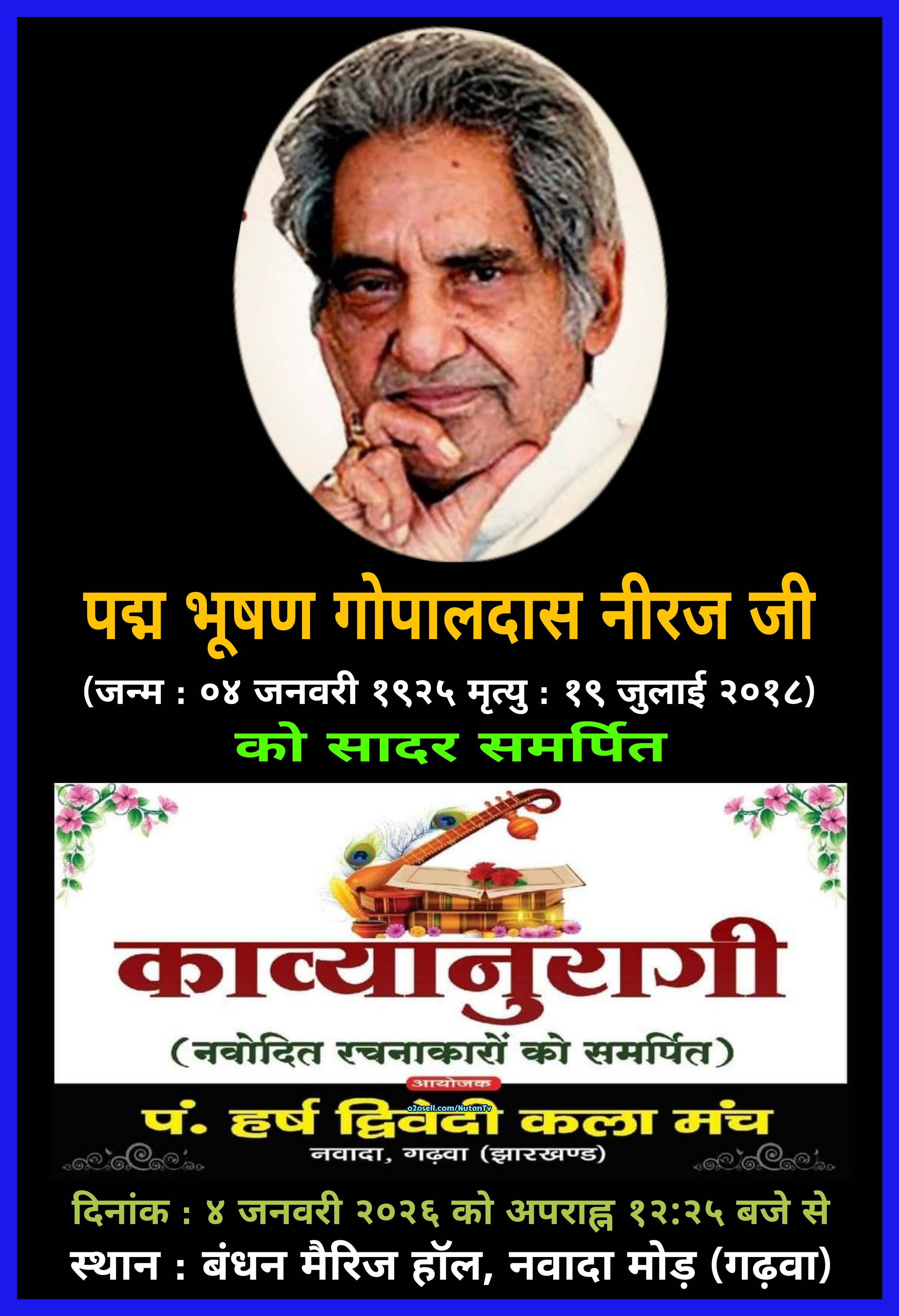 गढ़वा : नवोदित रचनाकारों को प्रोत्साहन एवं साहित्यिक मंच प्रदान करने के उद्देश्य से काव्यानुरागी कार्यक्रम का आयोजन आगामी 4 जनवरी 2026 को किया जा रहा है। बंधन मैरिज हॉल, नवादा मोड़ (गढ़वा) में अपराह्न 12:25 बजे से प्रारंभ होगा होने वाला यह आयोजन महान कवि और गीतकार पद्म भूषण गोपालदास नीरज जी को सादर समर्पित होगा।