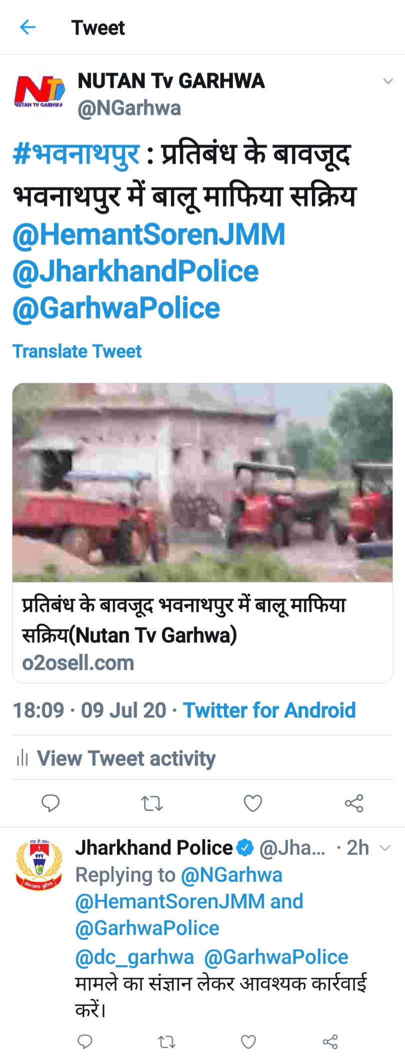 गढ़वा : प्रतिबंध के बावजूद भवनाथपुर में बालू माफिया सक्रिय शीर्षक नूतन टीवी के वेबसाइट पर दिखलाएंगे खबर को झारखंड पुलिस ने गंभीरता से लेते हुए संज्ञान में लिया है तथा अपने टि्वटर हैंडल से उपायुक्त गढ़वा तथा पुलिस अधीक्षक गढ़वा को इस खबर जुड़े मामले में संज्ञान लेते हुए कार्रवाई का निर्देश दिया है। मालूम हो कि झारखंड सरकार द्वारा नदियों से बालू के उठाव पर प्रतिबंध लगाने के बावजूद भवनाथपुर के विभिन्न नदियों से बालू का कारोबार बालू माफिया द्वारा सक्रियता से चलाया जा रहा है। इसी खबर के आलोक में गढ़वा के उपायुक्त तथा आरक्षी अधीक्षक को मामले को संज्ञान लेने का निर्देश दिया गया है। उम्मीद है कि भवनाथपुर की जनता की अपेक्षा के अनुरूप प्रतिबंधित बालू के उठाव के झारखंड सरकार के आदेश का अनुपालन करते हुए गढ़वा जिला प्रशासन सक्रिय बालू माफिया पर अब अंकुश लगायेंगे।