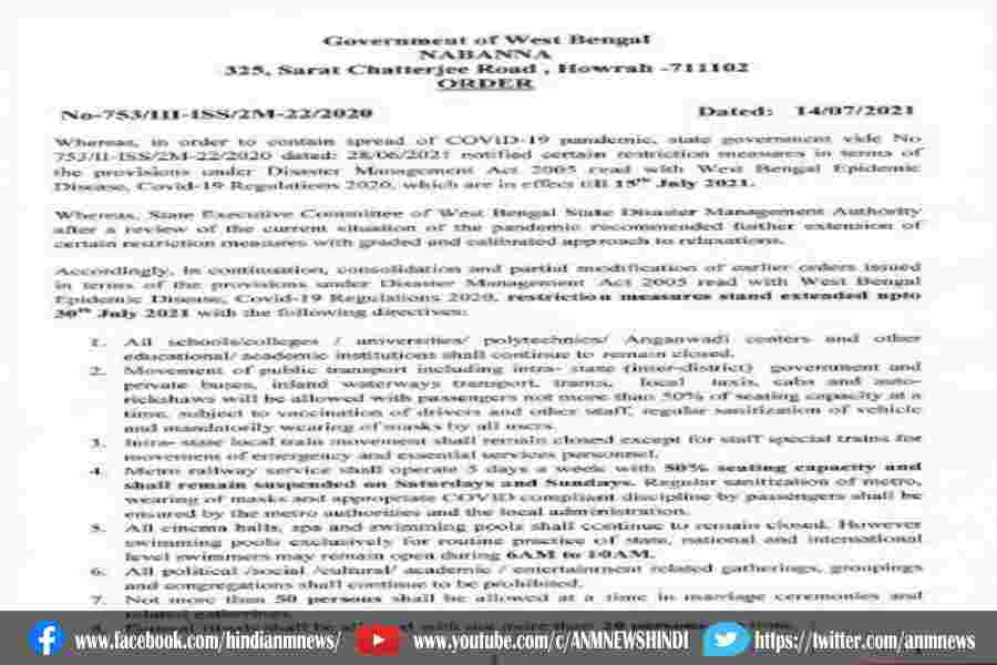 पश्चिम बंगाल सरकार ने कोविड 19 प्रतिबंधों में दी ढील