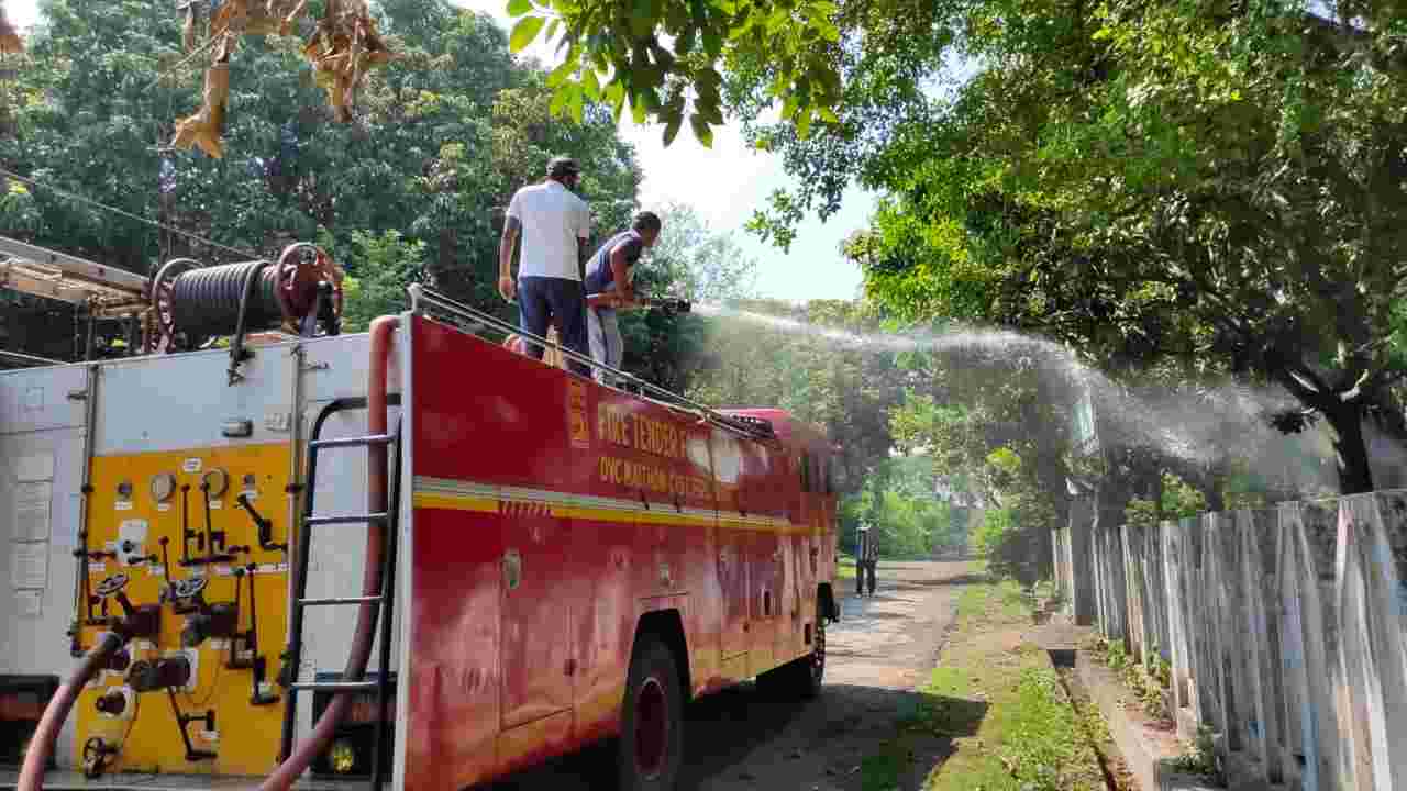 डीवीसी लेफ्ट बैंक कॉलोनी में निगम की ओर से सेनेटाइजर का कार्य