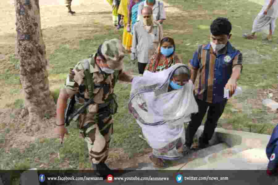 सुरक्षा बालो ने बुजुर्गों को मतदान केंद्र में प्रवेश करने में की मदद